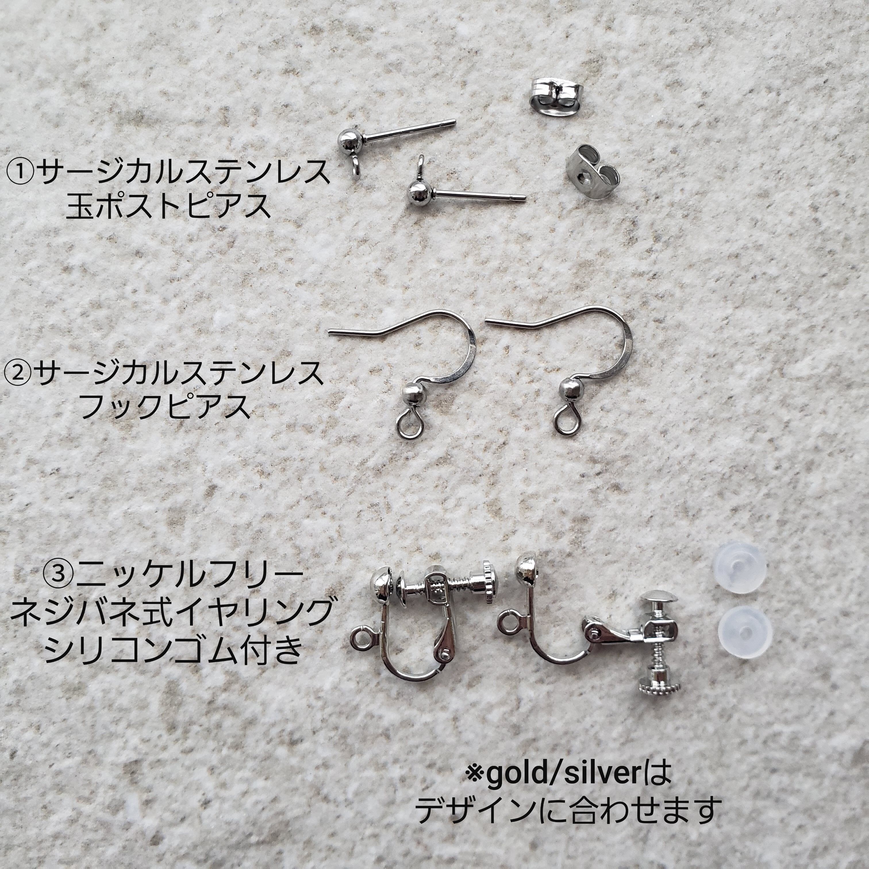 ▼イヤリングはニッケルフリーネジバネ式を使用しています。ご変更できない作品もありますのでご購入時にお間違いのないようにお気をつけください。